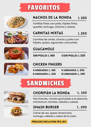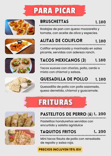 Deléitate con nuestra selección de platos, desde opciones ligeras hasta comidas completas y llenas de sabor. Perfecto para acompañar tus bebidas o disfrutar en cualquier momento. ¡Buen provecho!